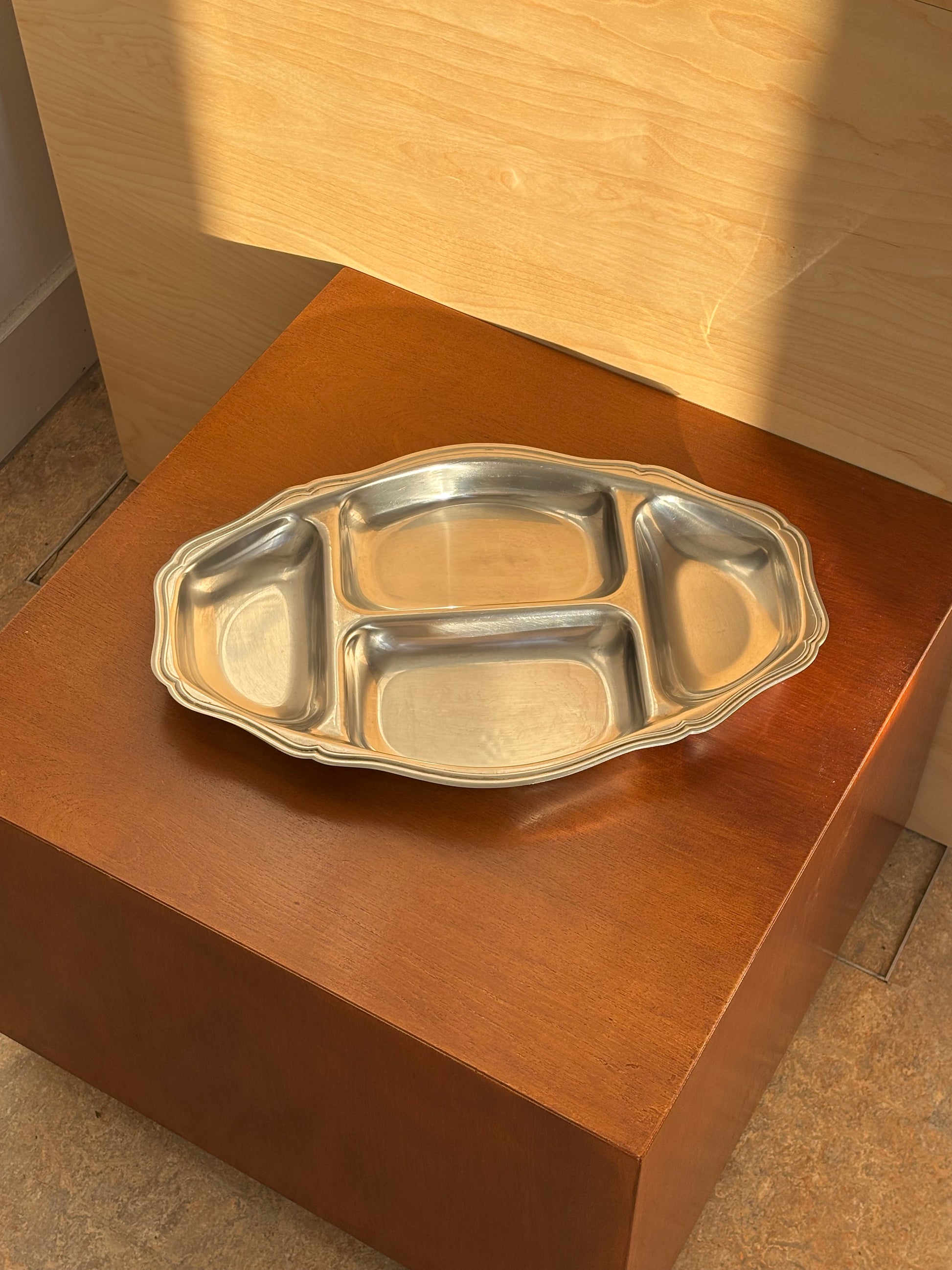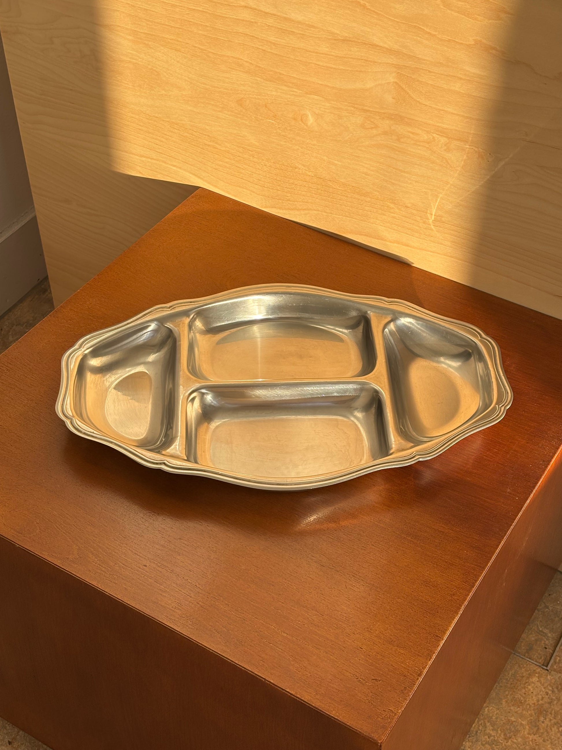 This stainless steel snack dish brings both charm and function to the table. Divided into neat compartments and framed by a classic scalloped edge, it’s made for serving — a handful of nuts here, olives there, something sweet tucked alongside something salty. Everything in its place, and looking good while it’s there.