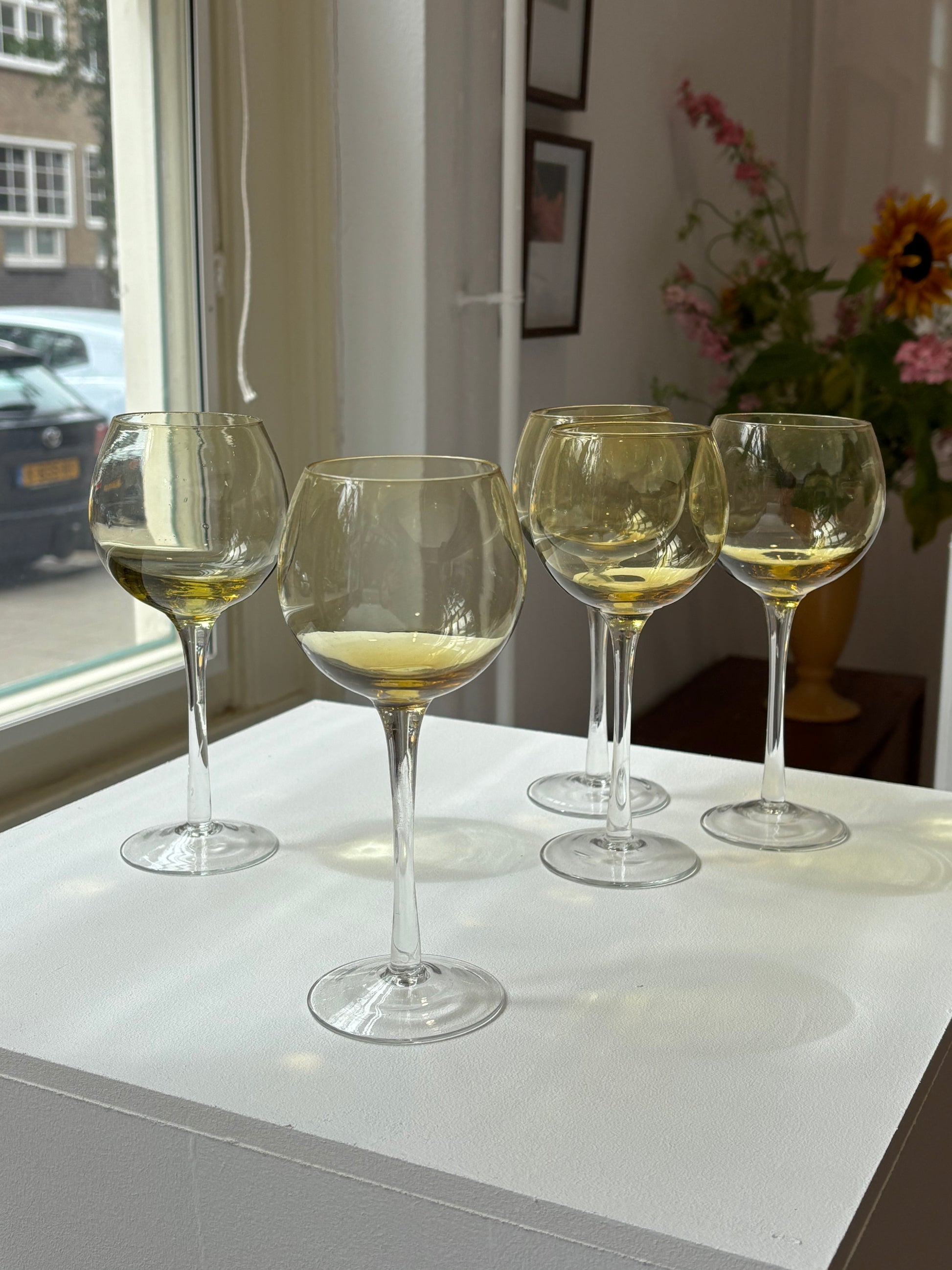 This set of five amber wineglasses brings warmth to the table — a golden hue that catches the light and glows from within. The color is deep but soft, like late afternoon sun or honey in glass form.