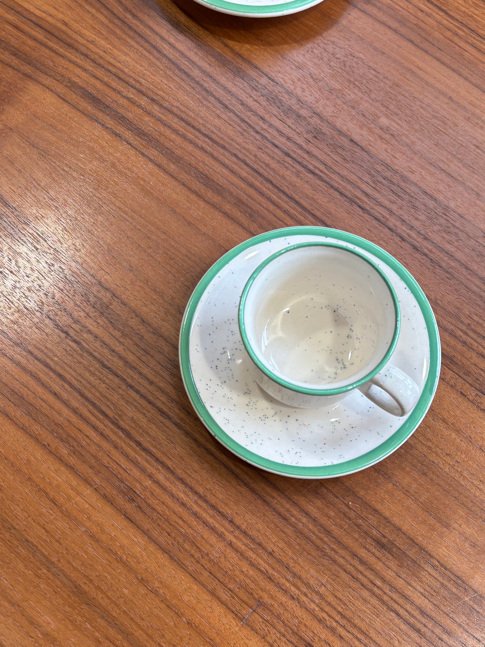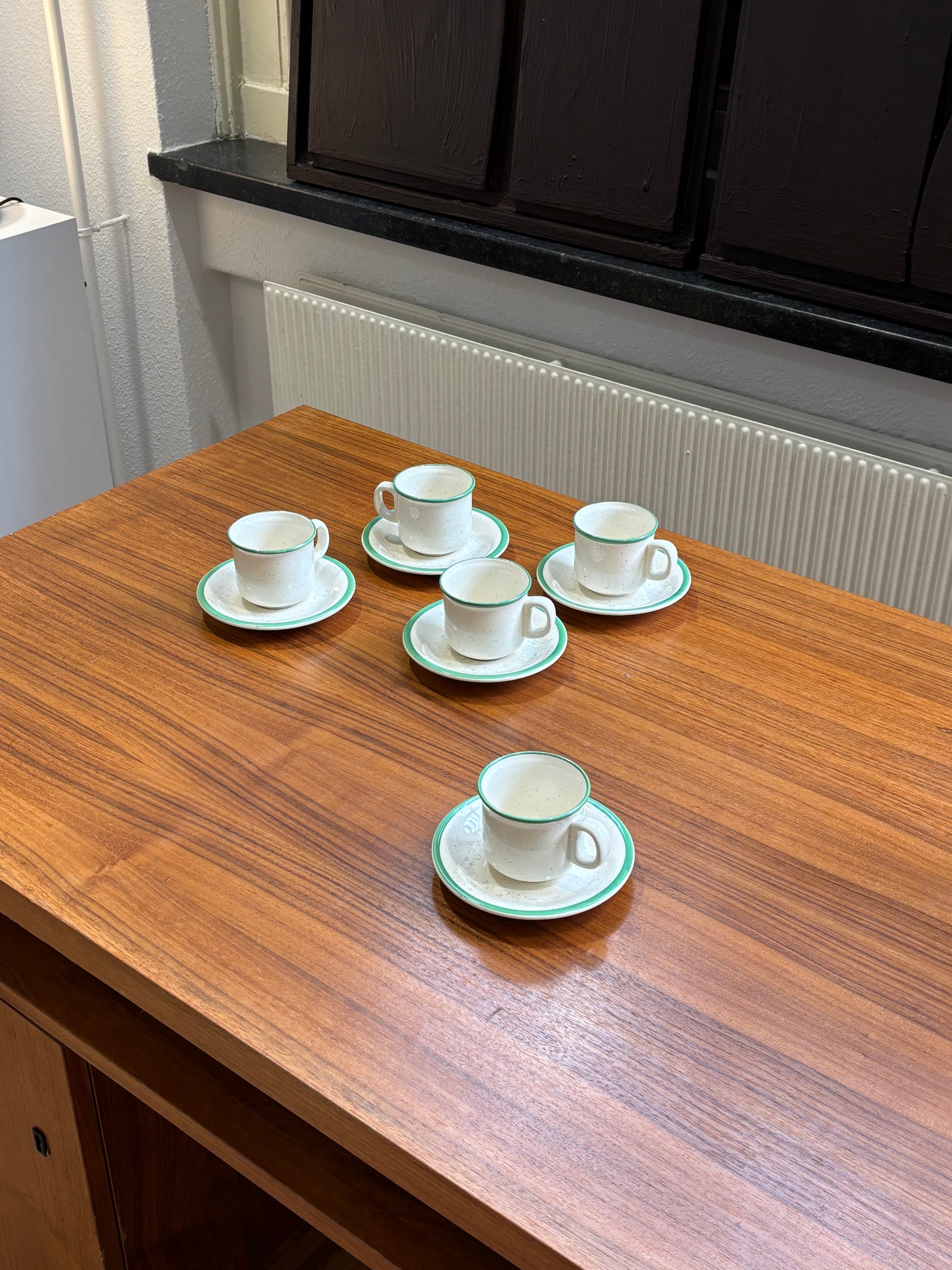 A set of five speckled coffee cups and saucers. Both the cups and saucers have a green rim with green speckles throughout the glaze.