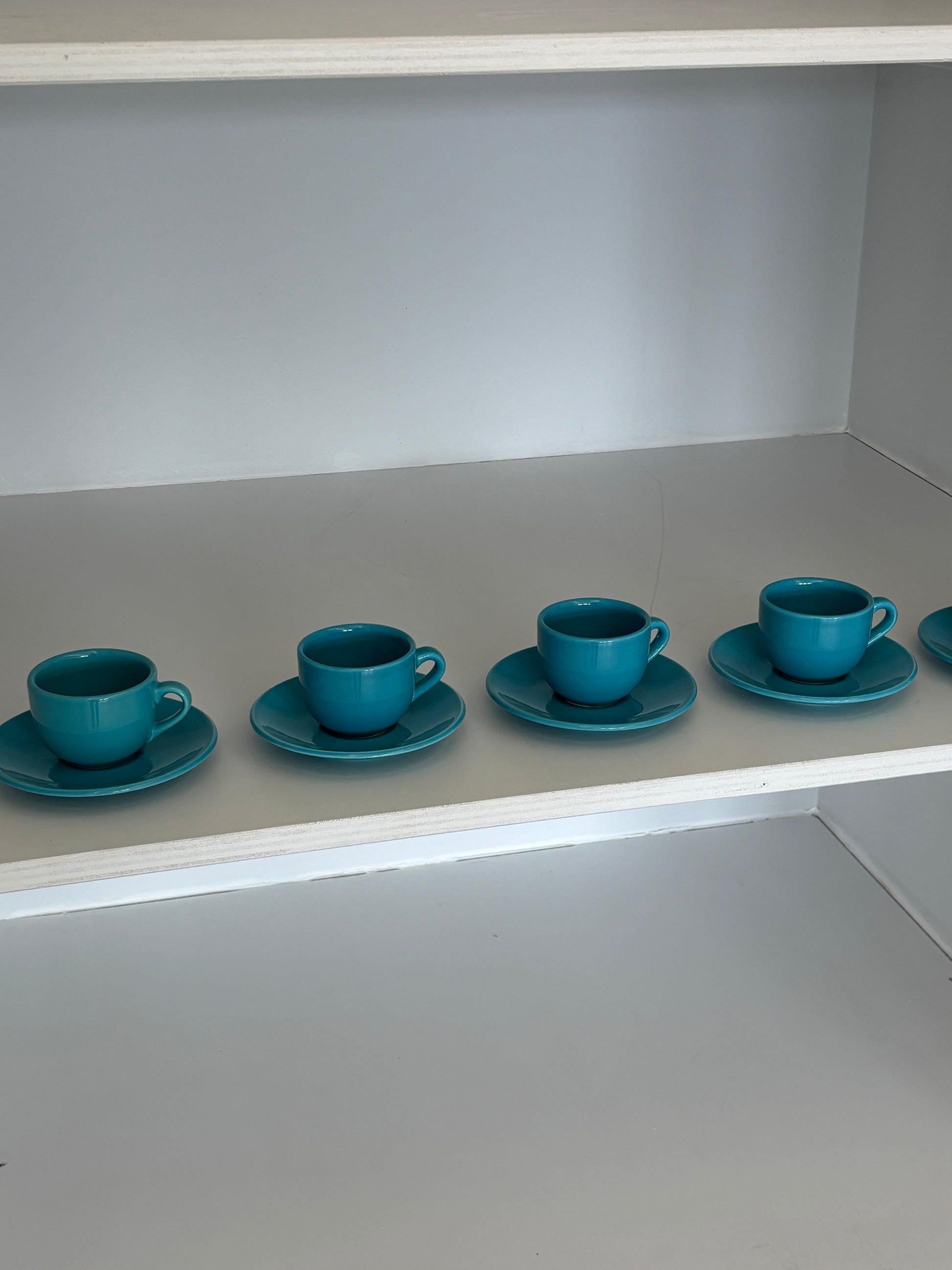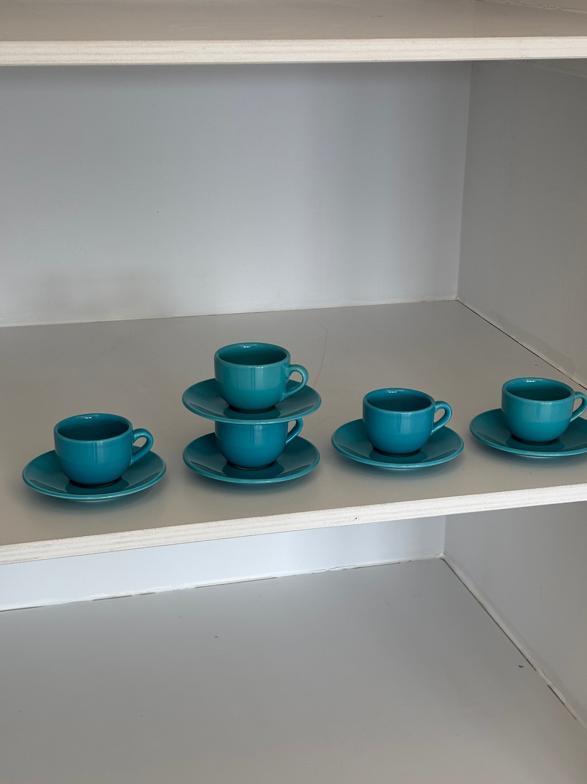 Set of five coffee cups with saucer in the colour petrol. Perfect for an espresso (the espresso crema matches perfect with the blue colour), small americano or espresso macchiato.