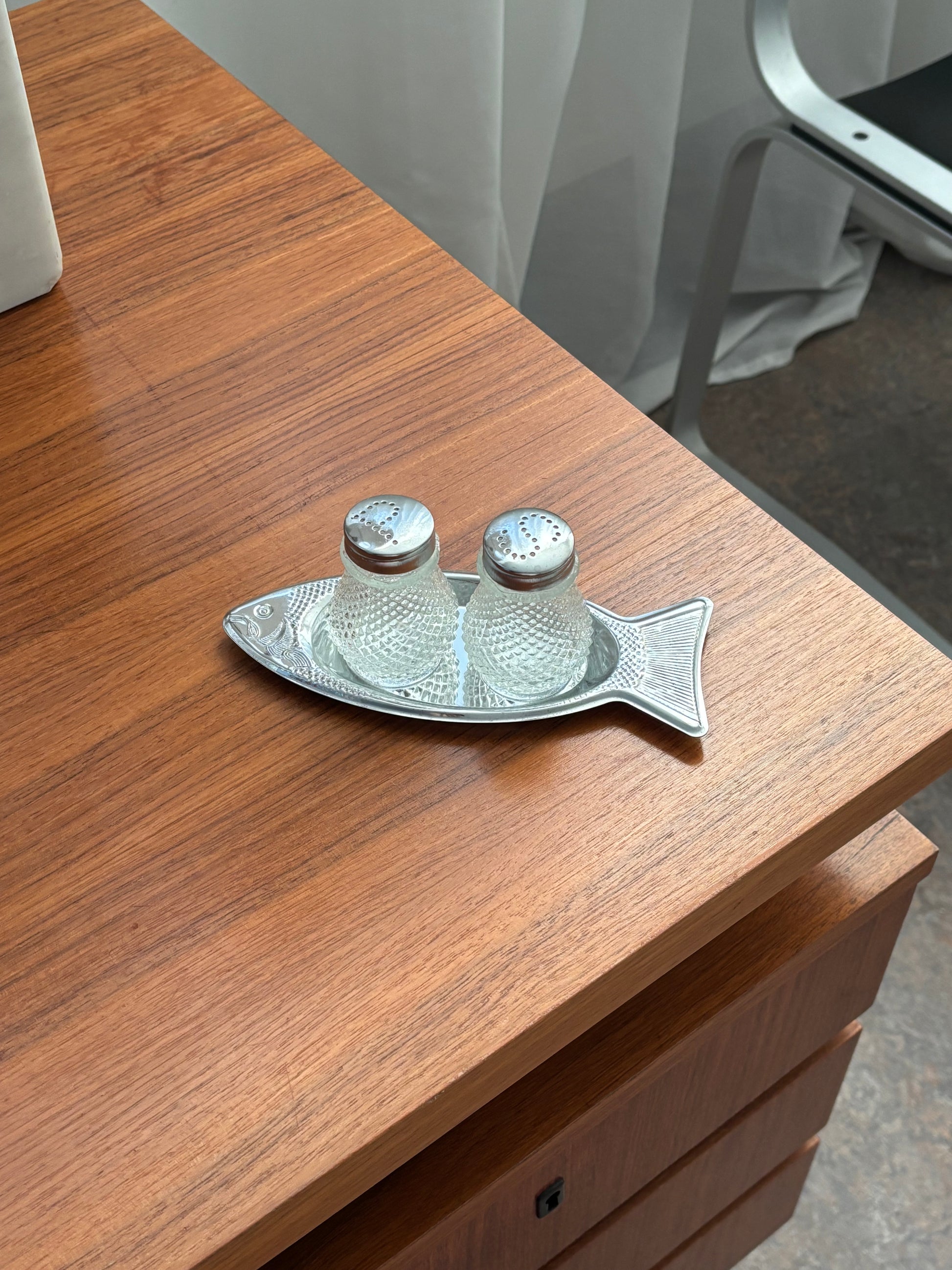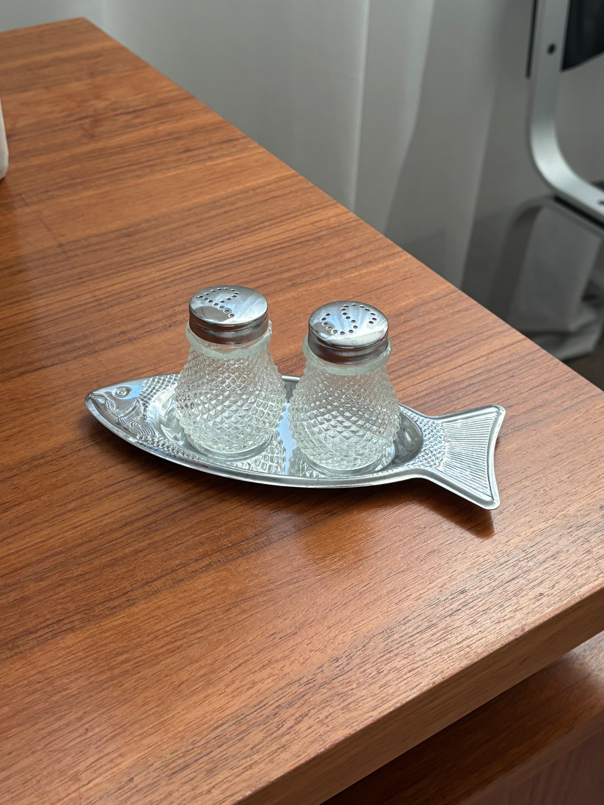 This classic set of salt and pepper shakers comes perched on a petite stainless steel plate shaped like a fish — a subtle nod to the sea with a sleek, modern twist. The shakers themselves are simple, like they have them in a French bistrot.