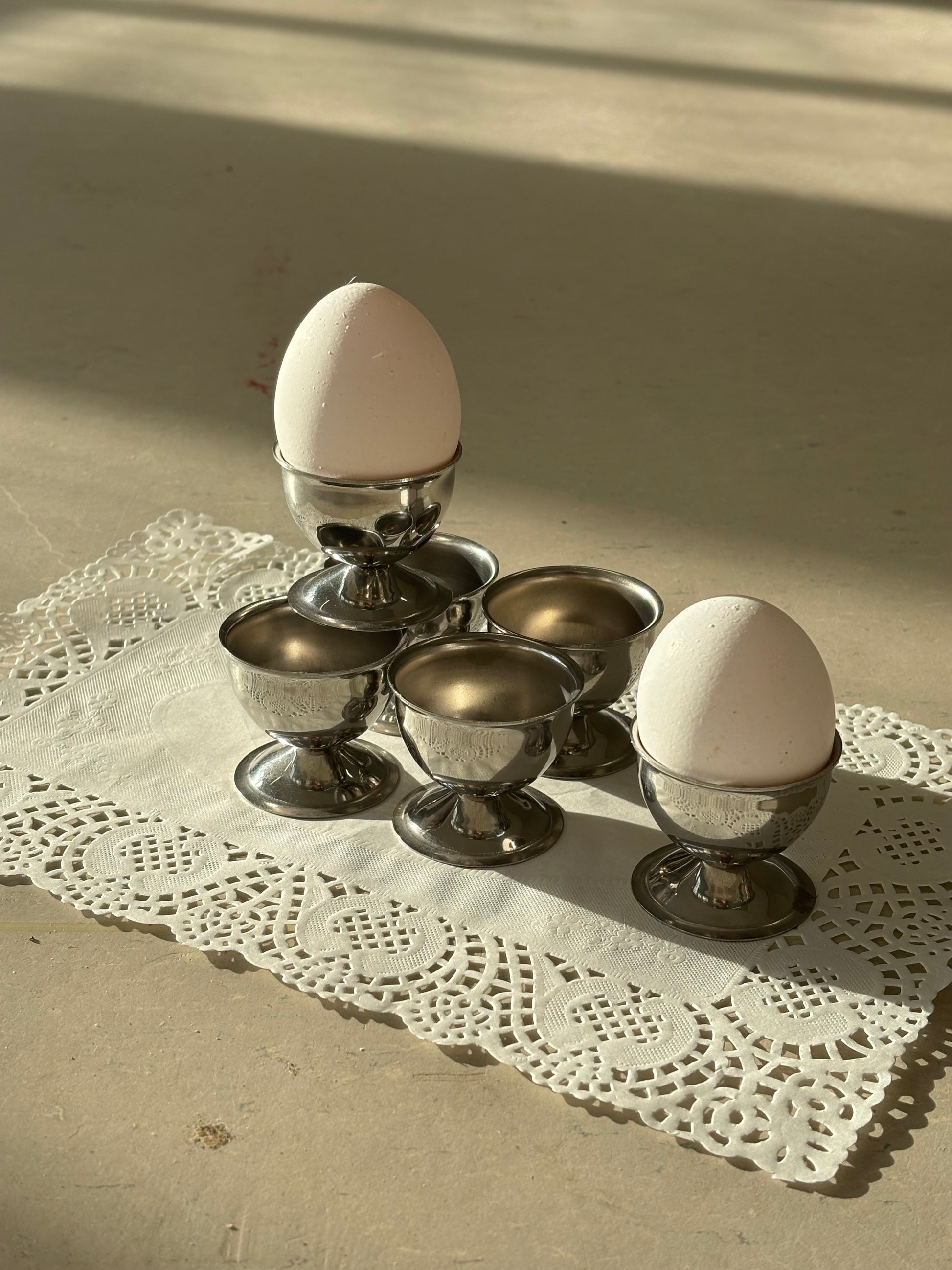 This set of six stainless steel eggcups keeps things simple — in the best possible way. Polished to a soft shine, each one is shaped to cradle a perfectly boiled egg, upright and ready. There's a quiet satisfaction in their weight, their balance, their just-right proportions.