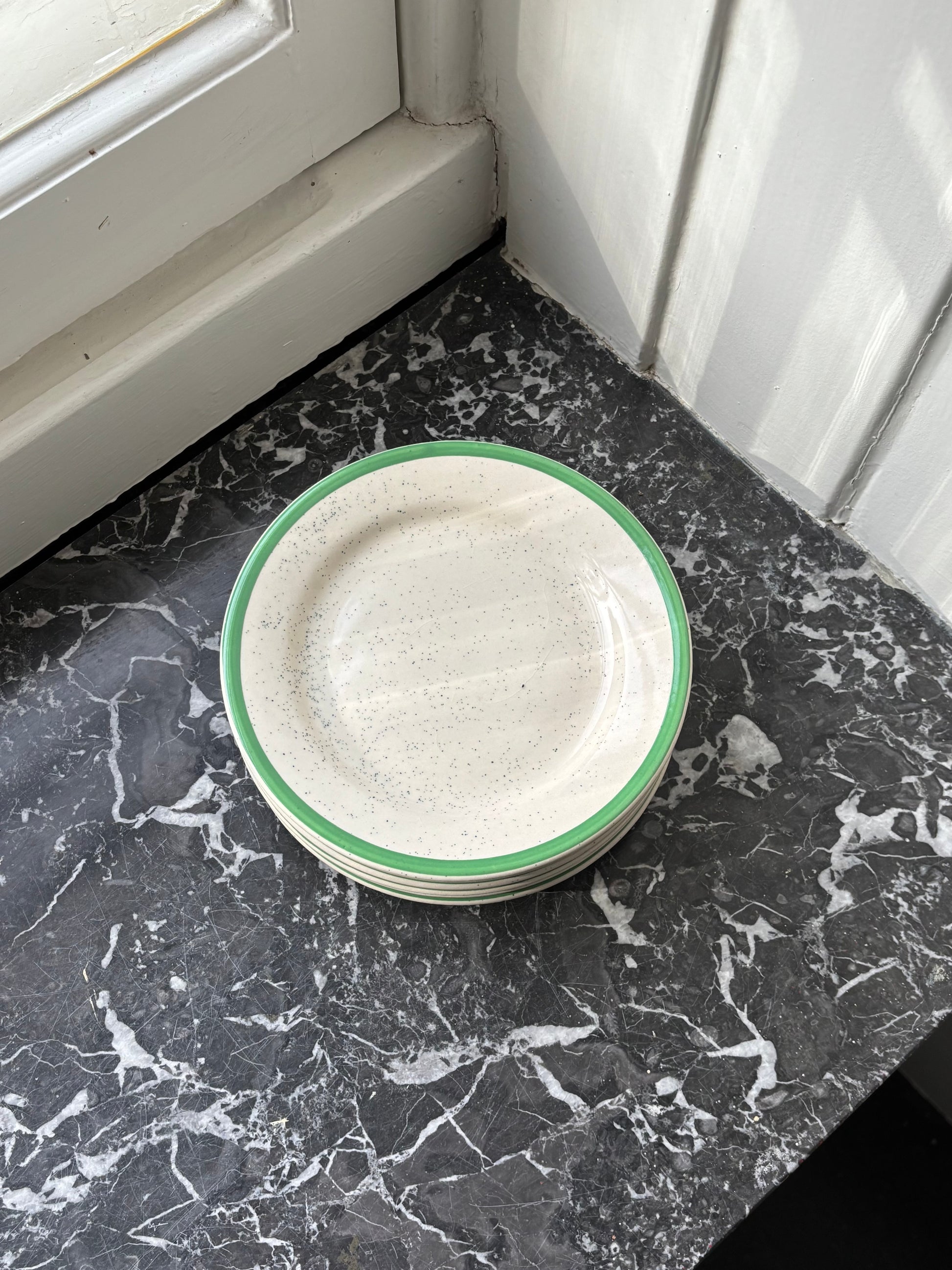 Set of six white plates with green rim and speckles. Perfect for your sunday morning breakfast.