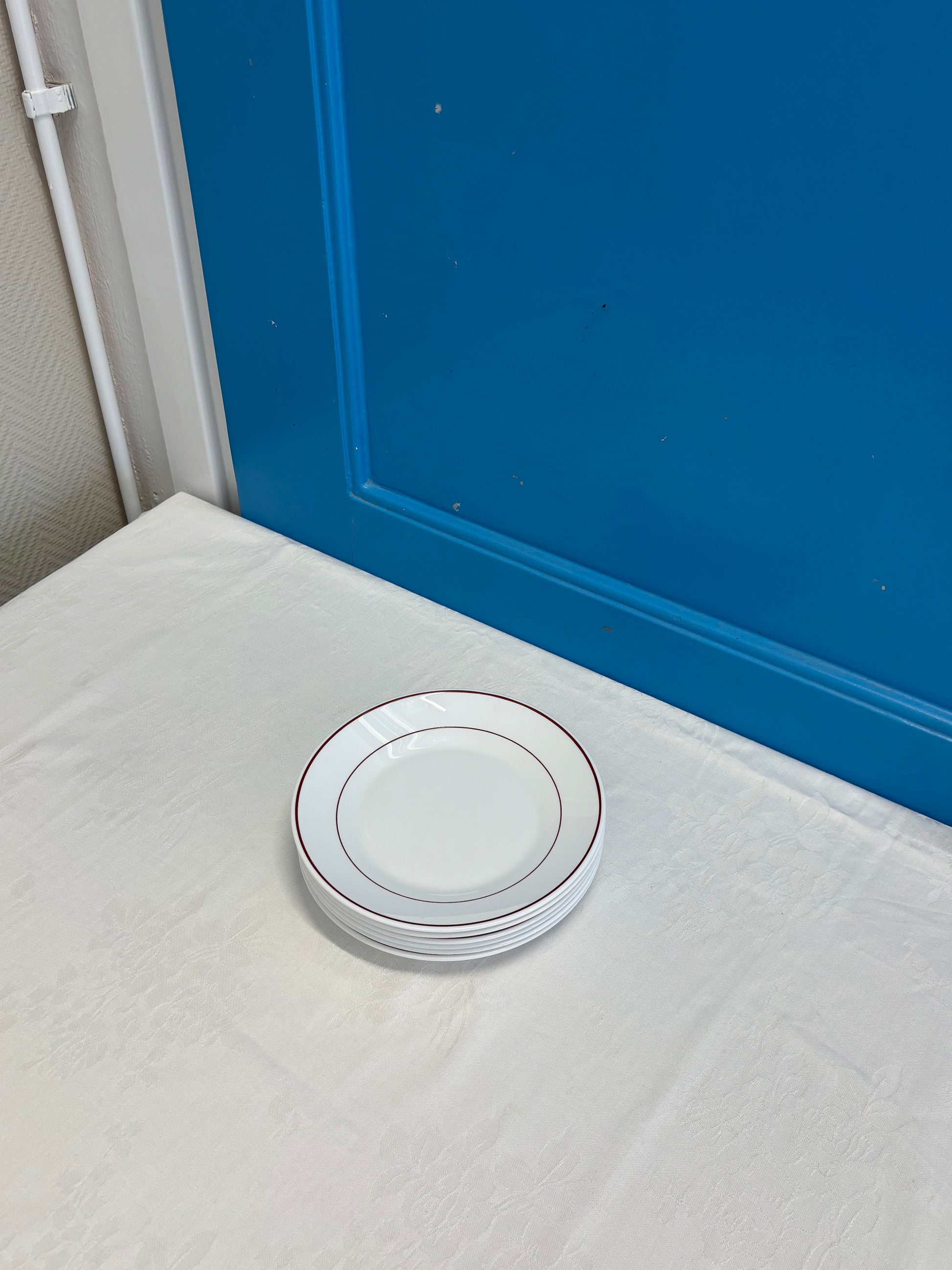 Five white plates with dark red rims. Perfect for sunday morning breakfast.