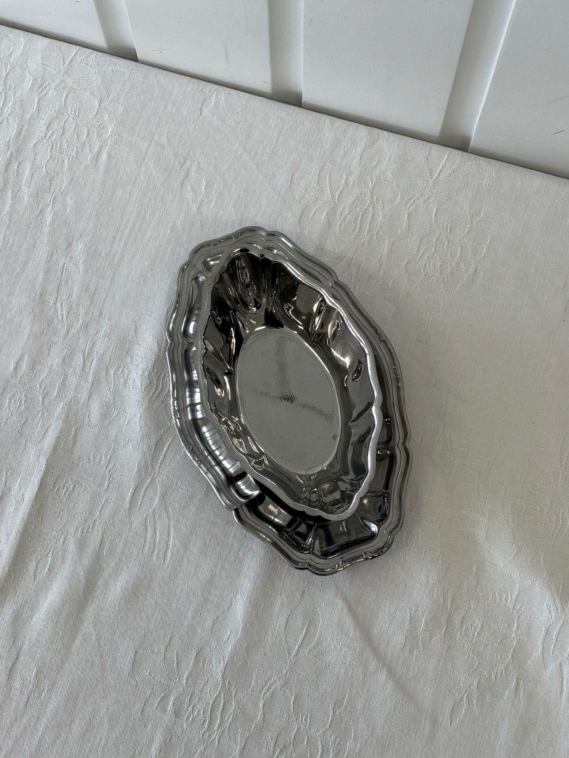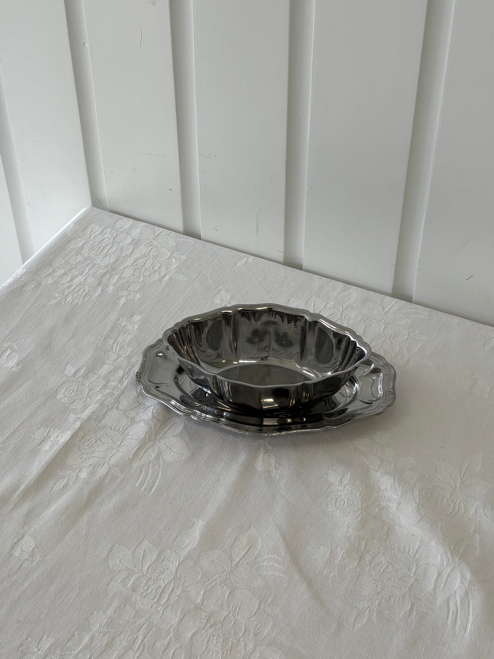 A versatile stainless steel gravy boat. You could use it for sauces ofcourse, but you can also see it as a bowl attached to a small plate. Add your favourite dip or some olives. Instant upgrade of your dinnerparty.