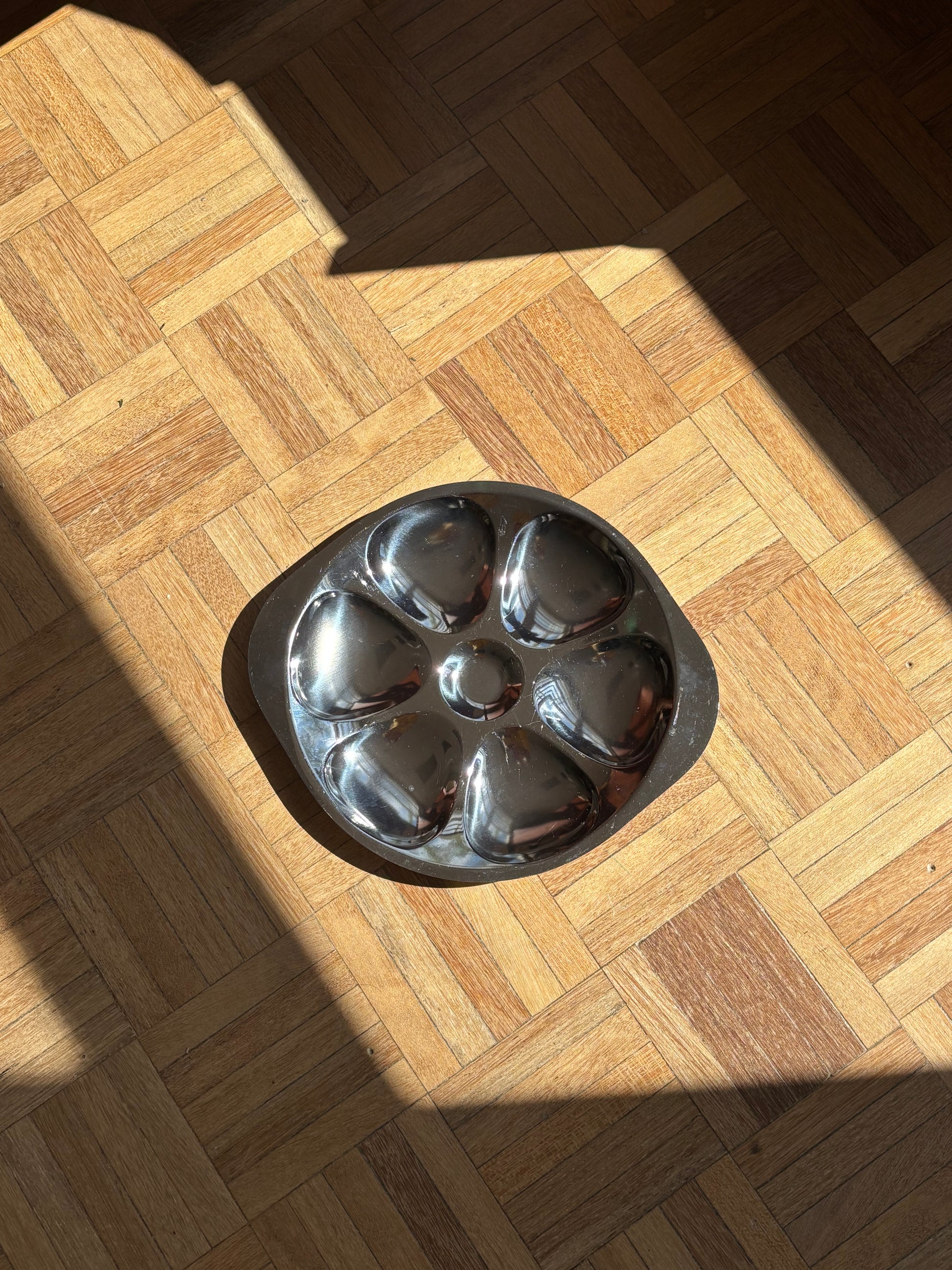This stainless steel oyster plate brings a quiet, refined elegance to your table. With it's minimalistic design, it’s a perfect blend of form and function. With space for six oysters, its smooth, reflective surface creates a striking contrast against the delicate shells, making each bite feel like an occasion.