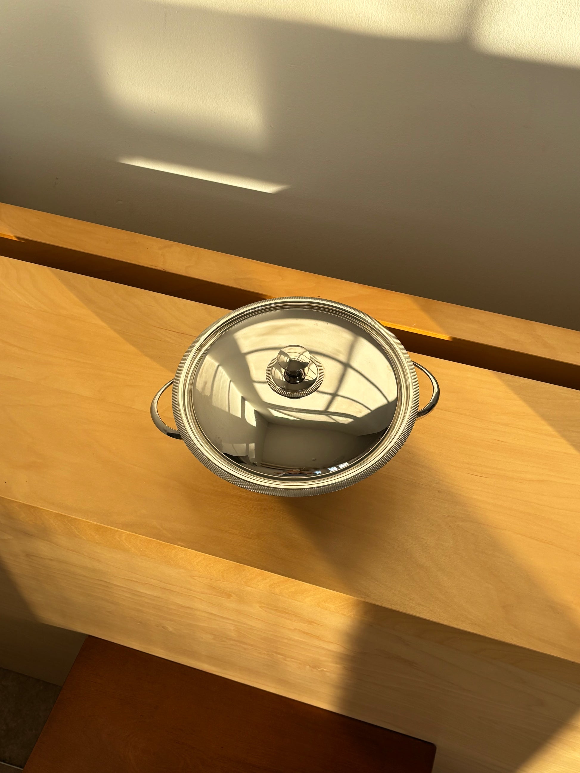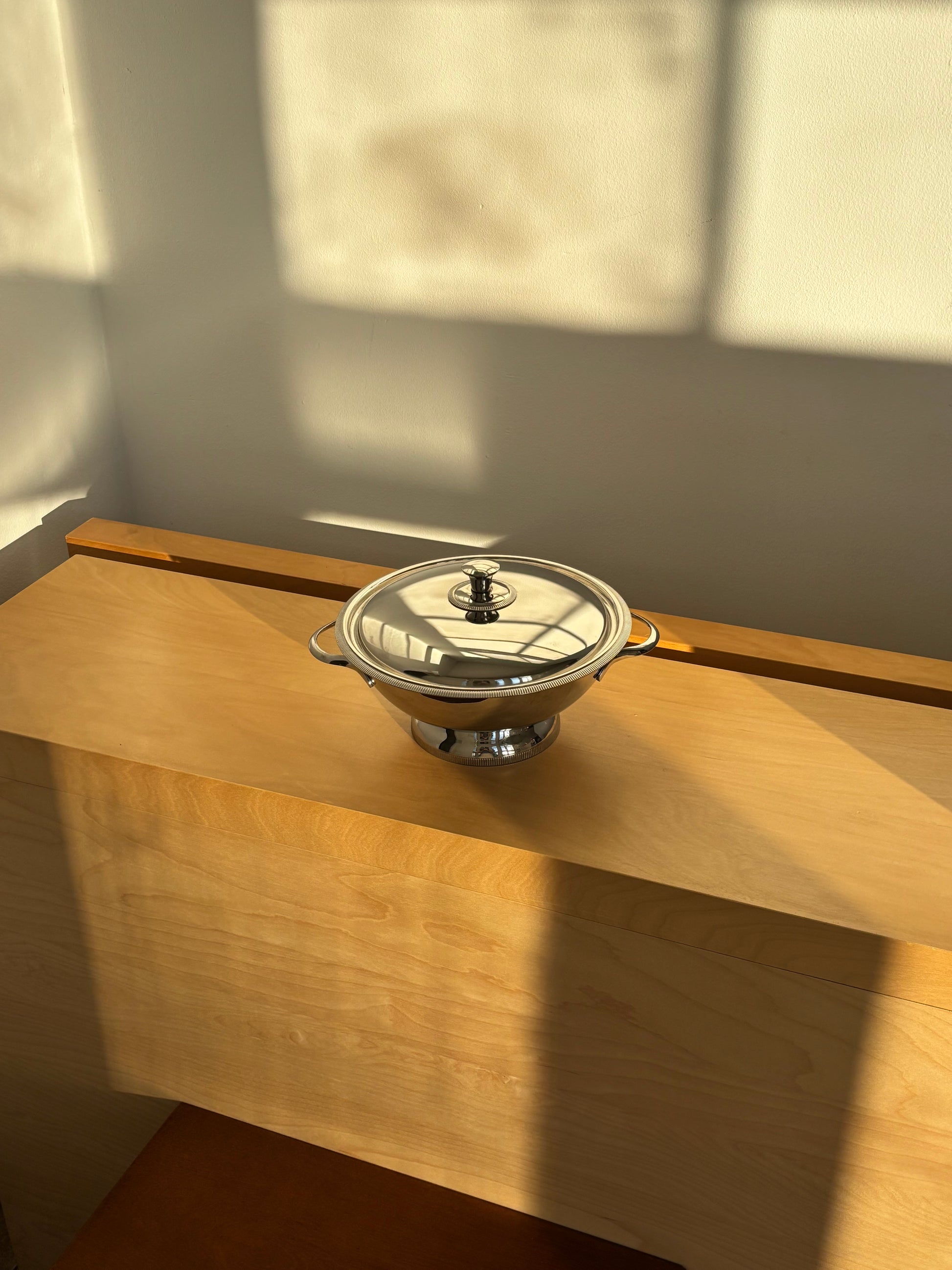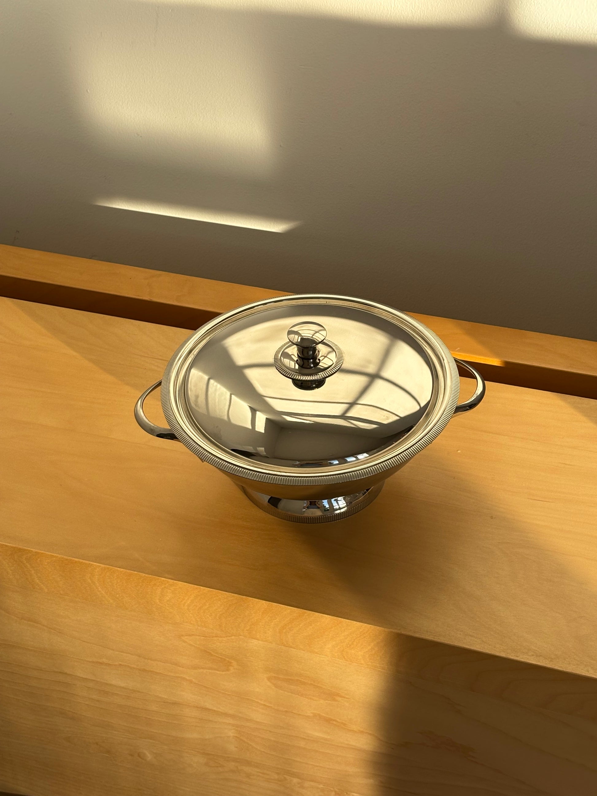 It’s the kind of bowl that might’ve once sat at the center of a family table, ladled from with care, then quietly closed again. The lid isn’t fussy — it’s deliberate. With etchings that speak softly of craftsmanship, it turns something functional into something quietly beautiful.