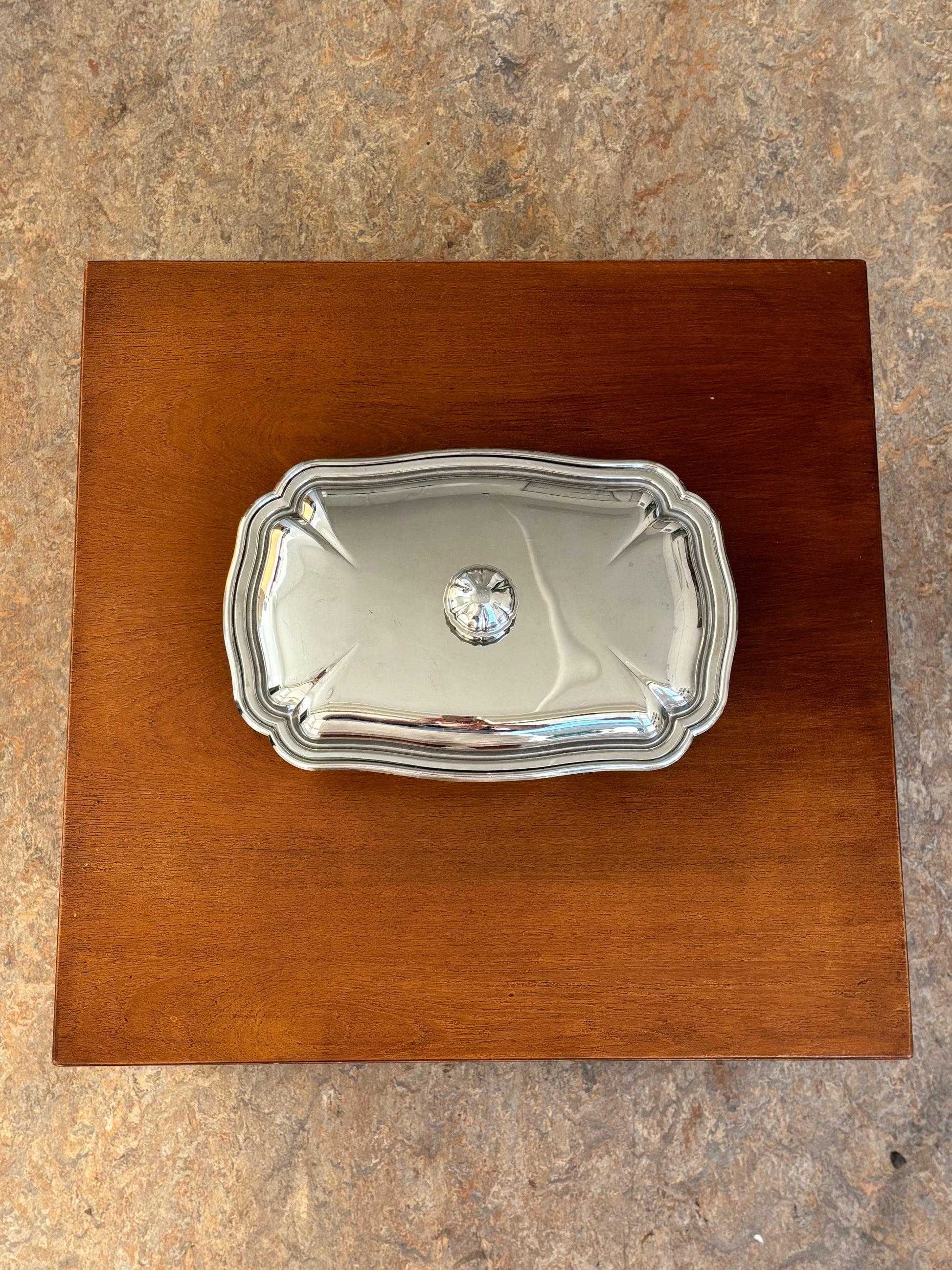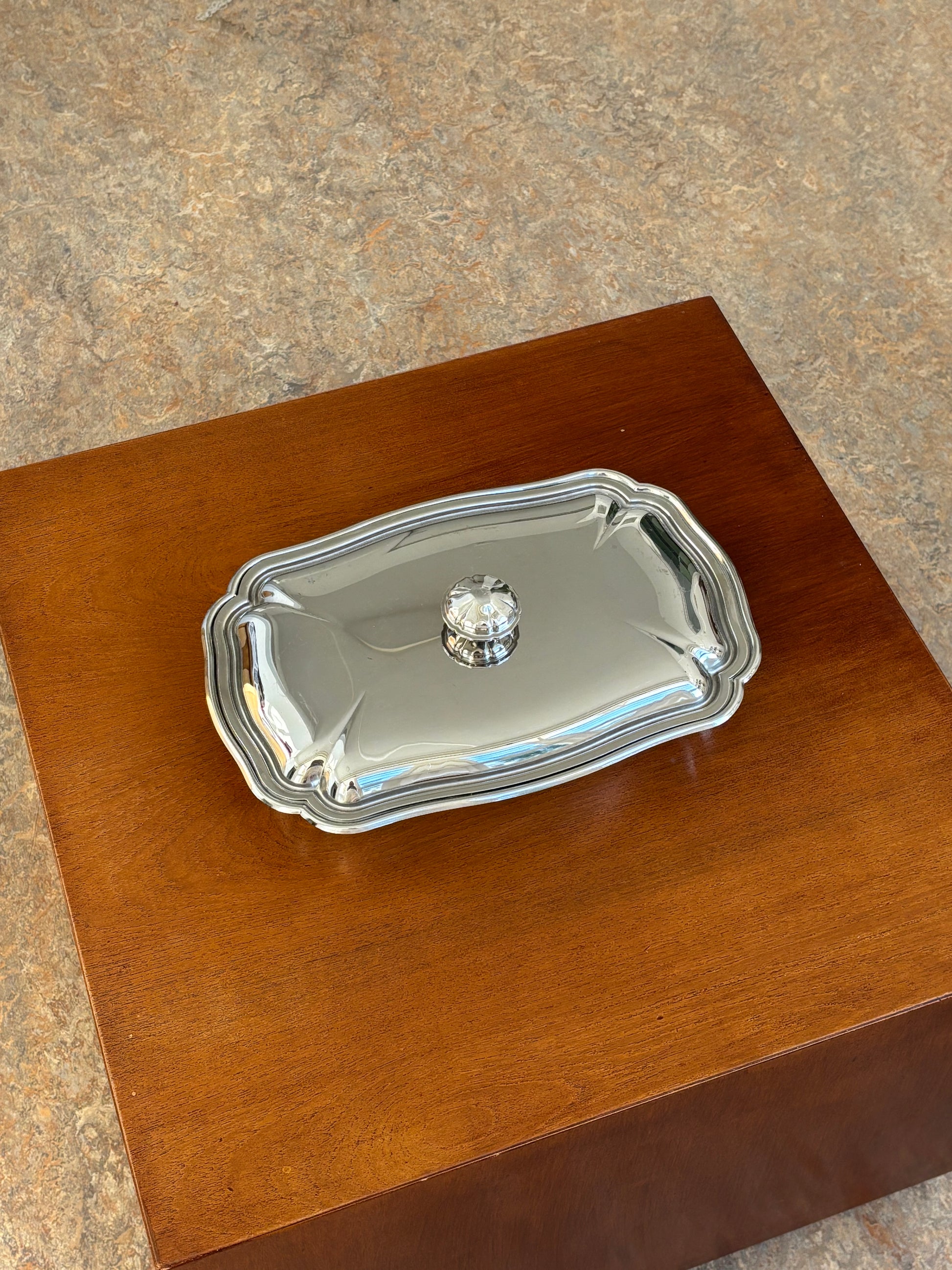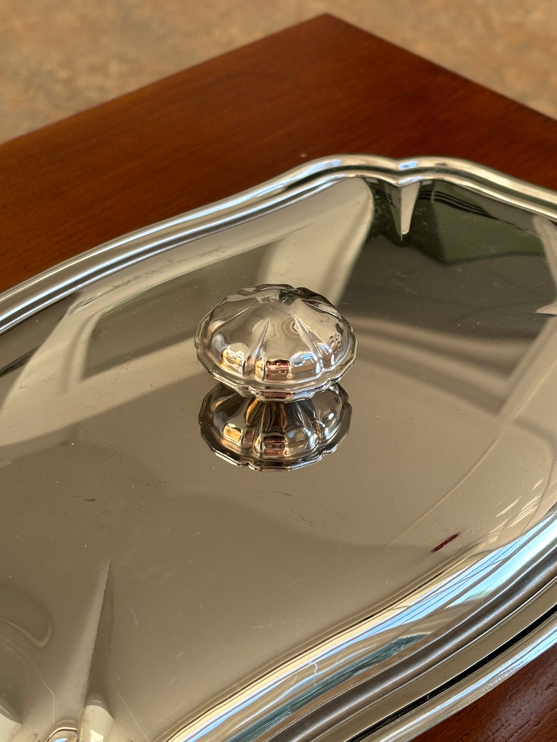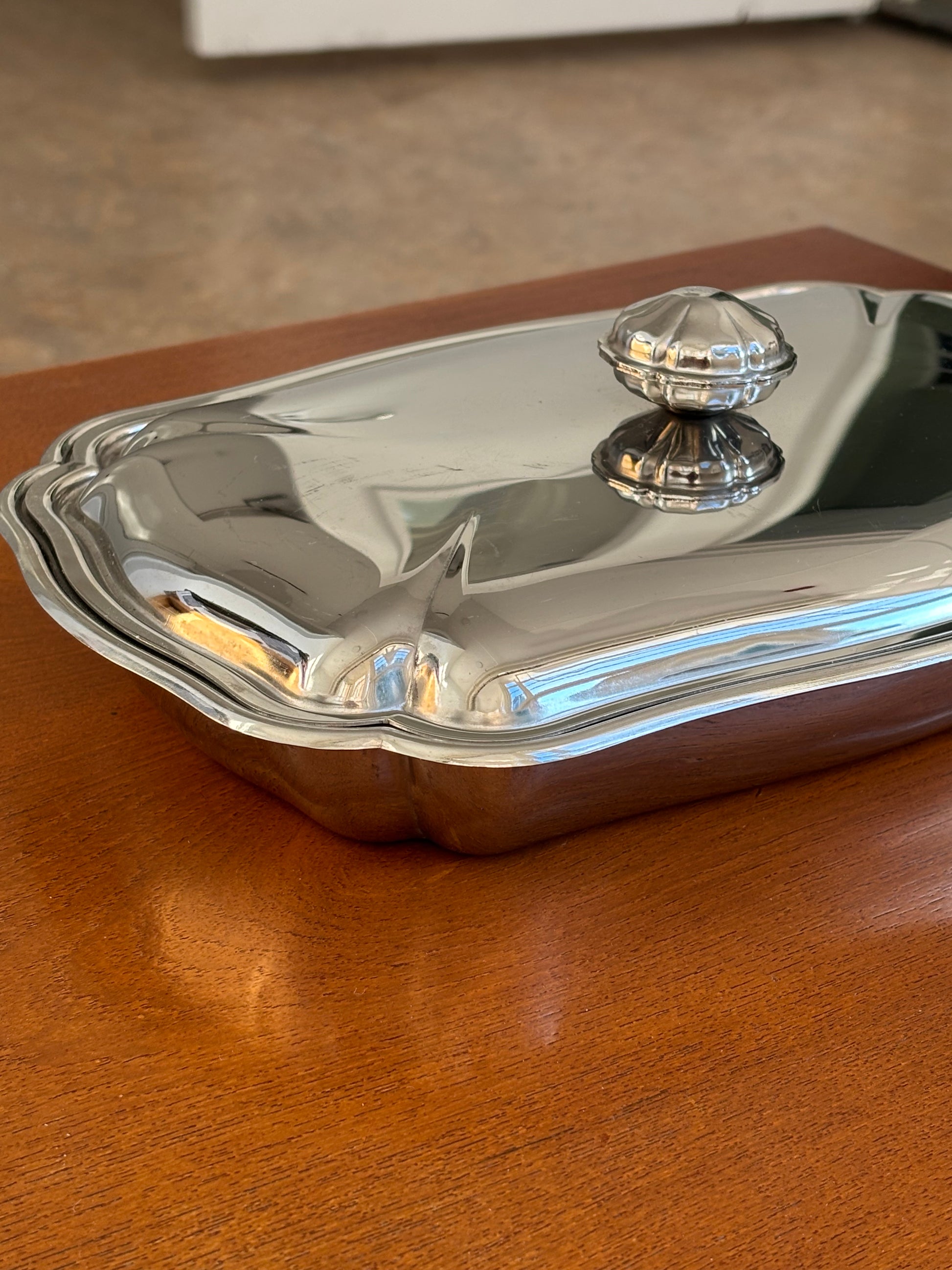 This rectangular stainless steel dish feels like a small treasure — smooth, weighty, and finished with a lid etched in quiet detail. There’s a softness to the shine, a certain stillness in the way it sits on the table, waiting to be opened.