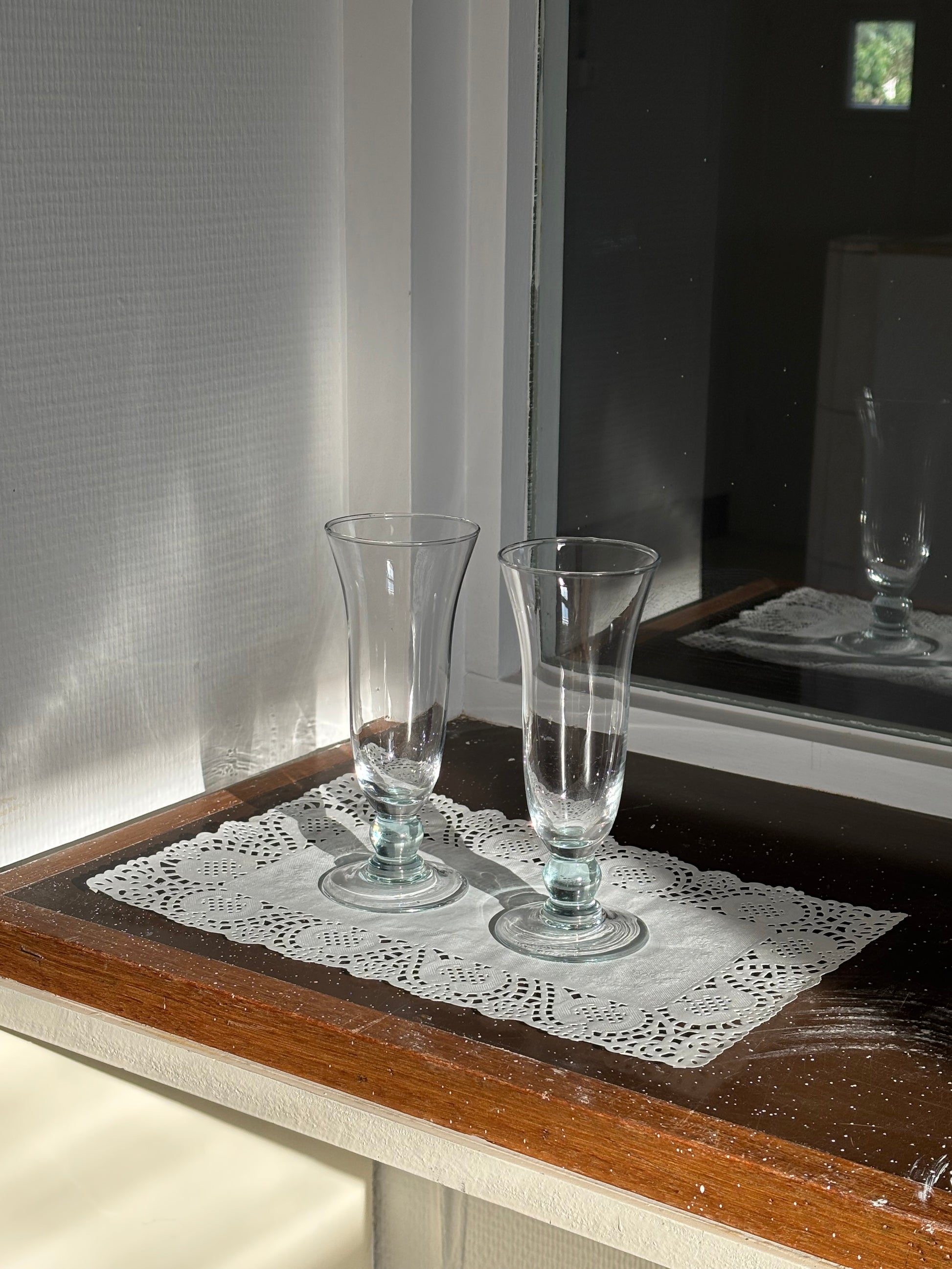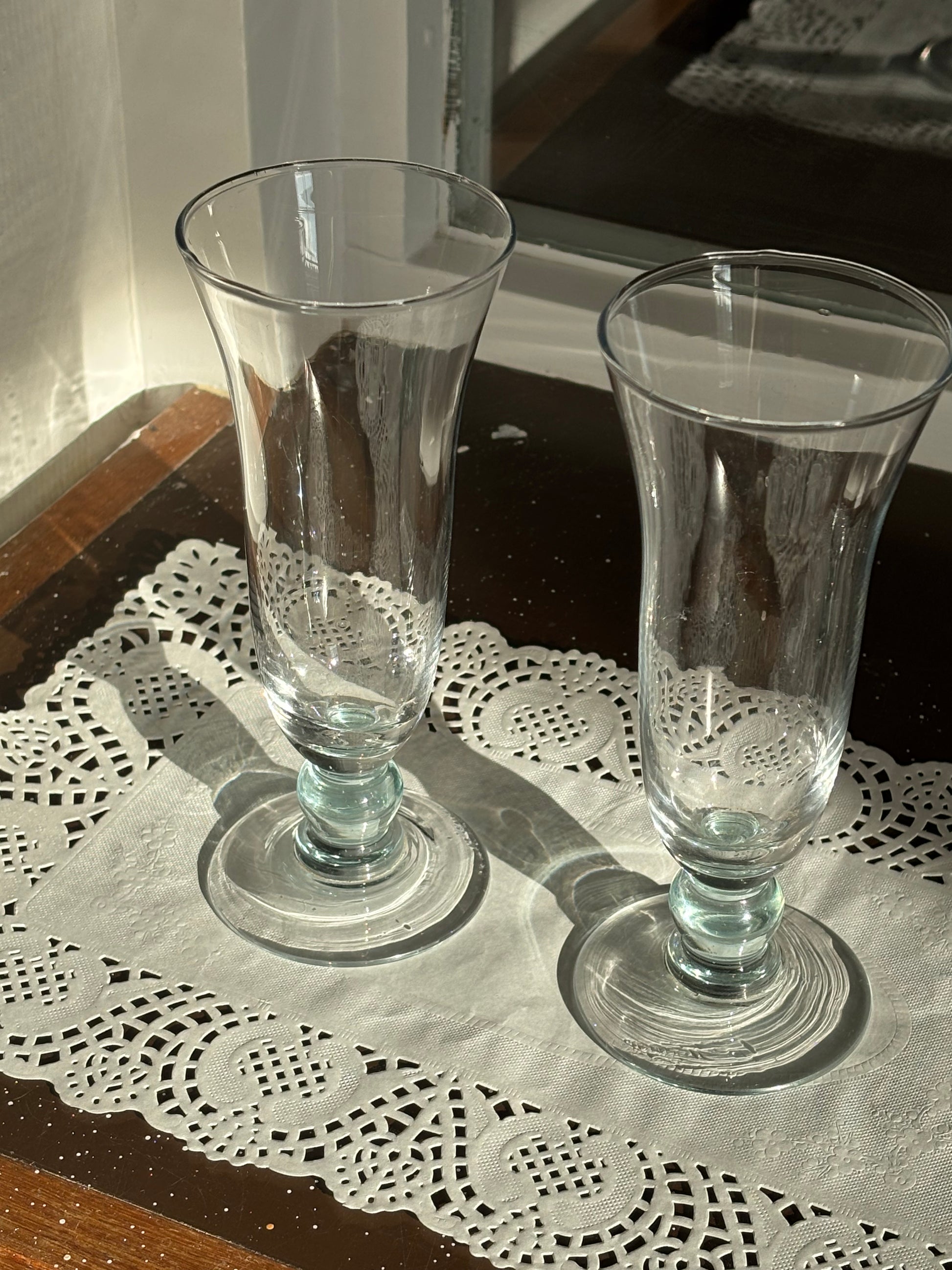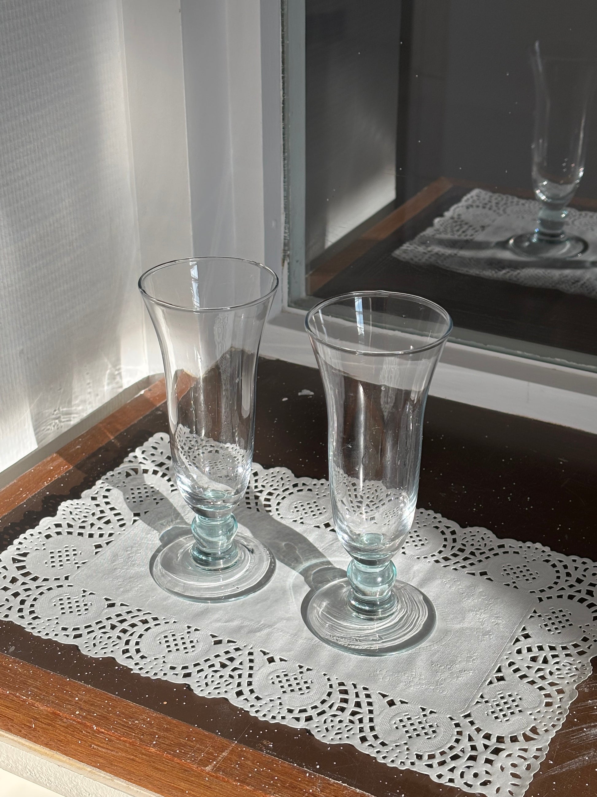 This set of two champagne flutes is all softness and light — the glass tinted the faintest blue, like morning sky or seafoam in sunlight. They’re delicate without being precious, tall and slender with a quiet grace that feels almost weightless in the hand.